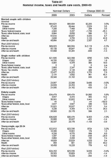 • After taking into account changes in both pre-tax income and taxes, the finding remains that most middle-income families lost ground between 2000 and 2003. Incomes declined slightly over this period (by 0.2%) for married couples with children and by 1.4% for elderly couples and young singles. Single-mother families saw after-tax income gains of 1.9% because of the greater refundability of child tax credits.