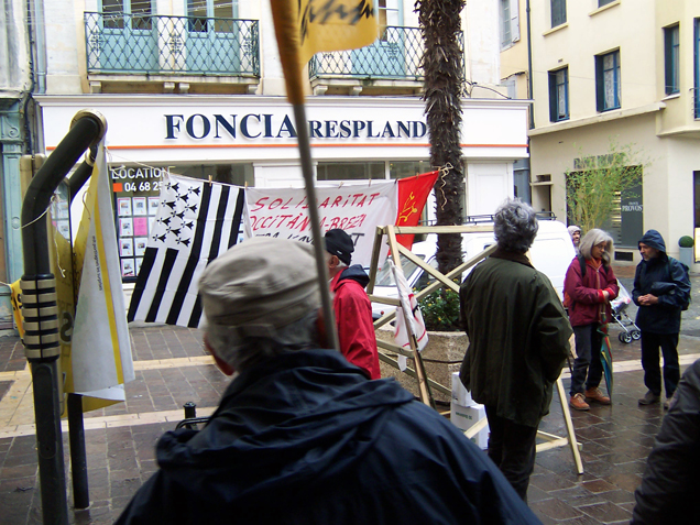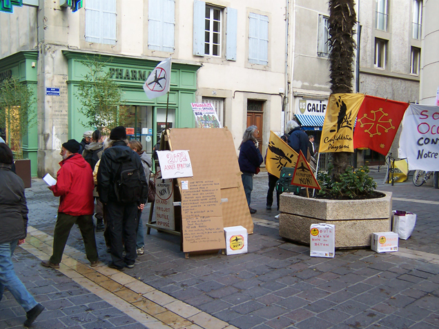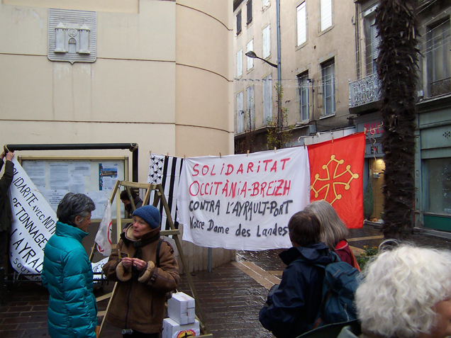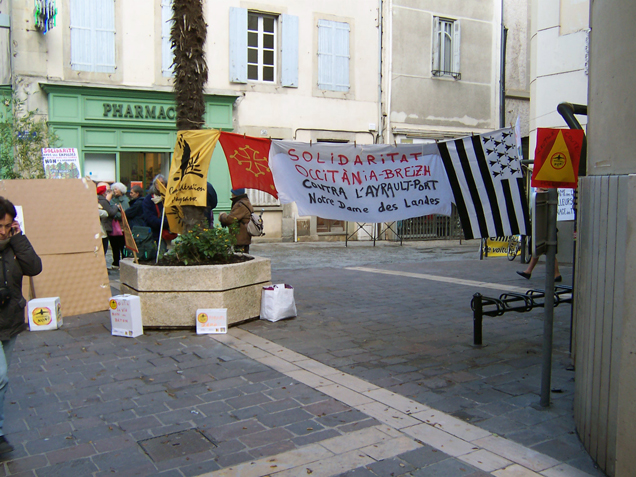 Publie le mardi 4 décembre 2012 par Comité Aude Soutien à la lutte de Notre-Dame-des-Landes - Open-PublishingAujourd’hui, 4 décembre 2012 : Action de solidarité avec la résistance contre l’Ayrault-port de Notre Dame des Landes, à côté de Nantes en Bretagne. Tout çà devant la Mairie (PS) de Carcassonne. / Accion de solidaritat amb la resiténcia contra l’Ayrault-pòrt de "Notre Dame des Landes", a costat de Nantes en Bretanha. Tot aquò davant l’Ostal de la Comuna (PS) de Carcassona