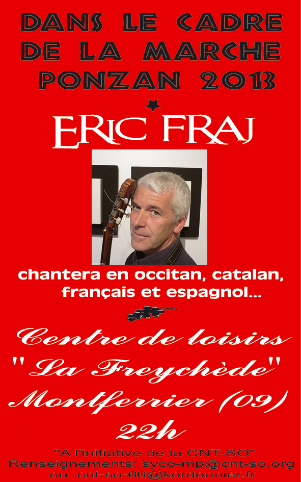 – 5€ pour le repas du soir, couchage (apporter sac de couchage ou draps), petit déjeuner. Soir à 22H : Musique avec ERIC FRAJ Chanson Occitan, Catalan, Castillan, Français.