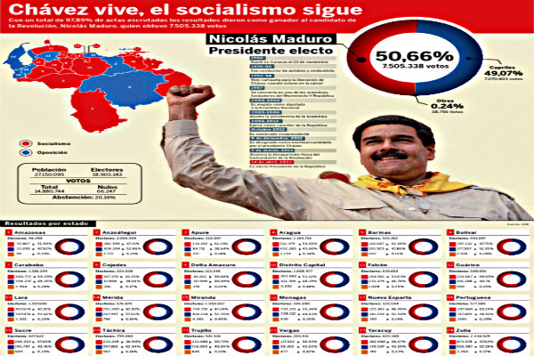 7. Le résultat serré ne remet pas en cause la légitimité de Nicolás Maduro. En guise de comparaison, en France, lors des dernières élections présidentielles de mai 2012, la différence entre François Hollande et Nicolas Sarkozy était seulement de 3,28%.