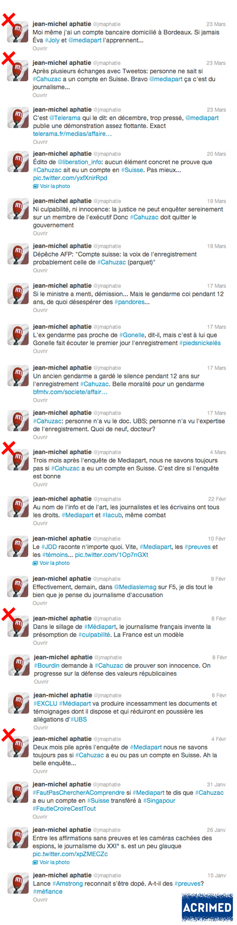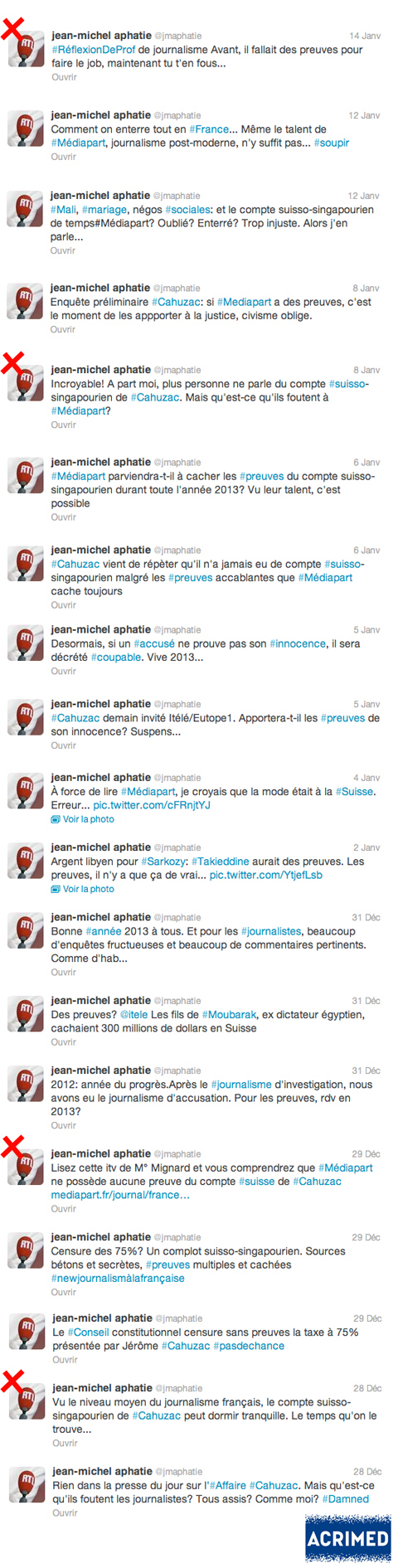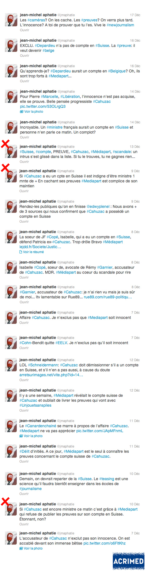 La preuve en images, avec cette compilation de l’intégralité des 80 (!) tweets de l’éditorialiste multicartes au sujet de l’affaire Cahuzac. Nous avons signalé nos tweets préférés par une croix, mais l’ensemble d’entre eux valent le détour, et donnent une idée de la sincérité de Jean-Michel Aphatie lorsqu’il tresse des lauriers à Médiapart.