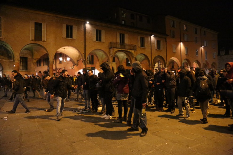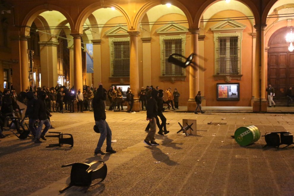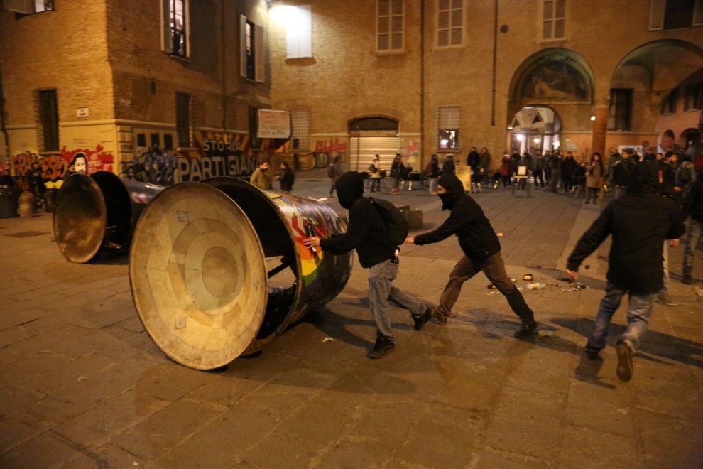 Contexte : des membres du CUA, Collettivo Universitario de Bologne (collectif d’étudiants) et de Làbas, groupe regroupé autour d’un squat, labasoccupato ont dénoncé la pose de portillons à l’entrée d’une bibliothèque universitaire, les ont démontés et l’ont occupée. L’intervention de la police jusque dans l’enceinte universitaire a soulevé des protestations jusque chez les plus modérés étudiants et s’est traduite par des bagarres et des barricades jusque dans la rue…