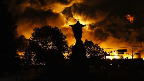 Dans la nuit du vendredi 5 juillet 2013, 72 wagons de pétrole, tractés par 5 locomotives SANS CONDUCTEURS explosent à Lac-Mégantic. Au moins 50 morts, le centre de la petite ville a été rasé, comme après un bombardement, on recherche encore les derniers cadavres.