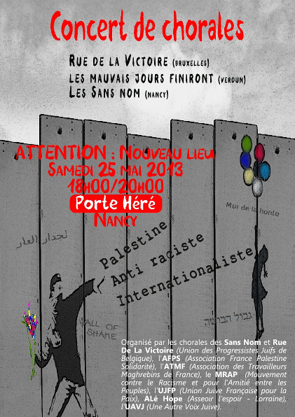 Concert de chorales pour la Palestine à Nancy le 25 mai 2013 : NOUVEAU LIEU !