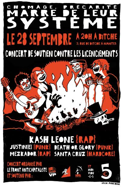 Ce concert militant, alternant entre Rap et Punk, est organisé par le Front anticapitaliste 44 en vue de lutter contre les licenciements et la précarité.