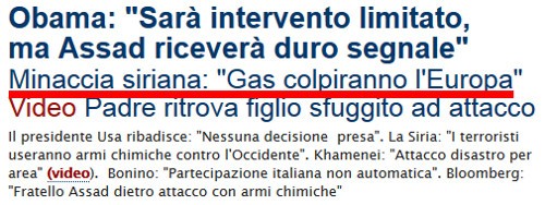 Les premières pages en ligne du 28 et 29 août 2013 de tous les quotidiens italiens titrent par exemple que « la Syrie menace de frapper l’Europe avec des armes chimiques », déformant en toute mauvaise foi les propos d’un homme politique syrien qui disait toute autre chose. Le vice-ministre des Affaires étrangères, Faisal Maqdad, critiquait en réalité les pays qui aident les « terroristes » (c’est-à-dire les rebelles djihadistes) à utiliser des armes chimiques en Syrie, mettant en garde sur le fait que ces mêmes groupes ennemis de Damas « les utiliseront bientôt contre le peuple d’Europe ». Traduction : attention Europe, tu es en train de se tirer une balle dans le pied. La phrase correcte est ensuite citée au milieu de l’article. Mais chacun peut voir les gros titres de La Stampa et de La Reppublica (et tous les autres [...] font la même chose) :
