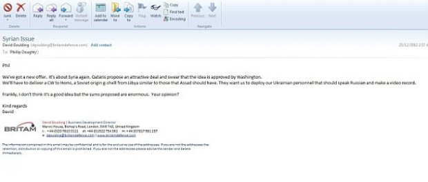 L’article de Boyle se poursuit : « L’email aurait été envoyé par un haut responsable à un fournisseur de la Défense britannique au sujet d’une attaque chimique ‘’approuvée par Washington’’ en Syrie, de façon à faire porter le chapeau à Assad. »