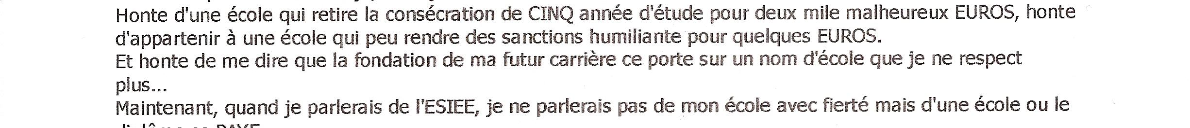 Un étudiant français de famille très modeste inscrit dans le programme égalité des chances n’a pas pu avoir son diplome acquis honorablement après 5 ans d’études et de travail pour assumer sa famille et ses études. Simplement parce qu’il ne pouvait pas payer les frais de scolarité. c’était la décision du directeur de l’ESIEE Pierre Loonis.