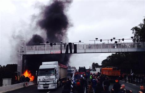 Ecotaxe. Le portique de Saint-Allouestre (Morbihan) en feu (videos)