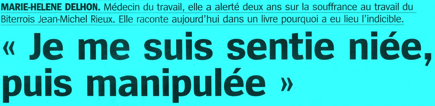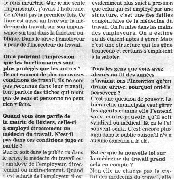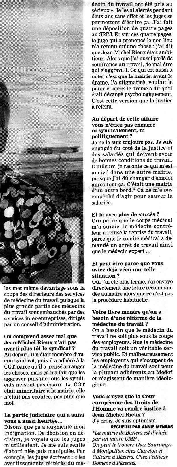 Pour le NPA, un nouveau drame lié à la souffrance au travail repose la question de l’isolement, des mesures vexatoires, de la mise au placard...C’était en effet aussi les mêmes ingrédients dans le drame de Lise Bonnafous et de Jean Michel Rieux. Béziers paie décidément un très lourd tribut à des gestions de relations humaines d’un autre âge mais d’un même système ... celui de l’oppression.