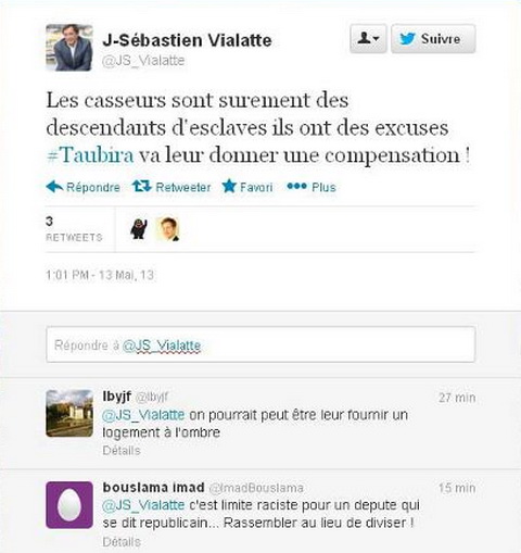 Alors que ce qui était censé être une fête en l’honneur du PSG s’est transformé en « casse party », Jean-Sébastien Vialatte, député du très progressiste département du Var a eu ces mots en direction des prétendus casseurs : « Les casseurs sont sûrement des descendants d’esclaves ils ont des excuses #Taubira va leur donner des compensations ». Charmant.