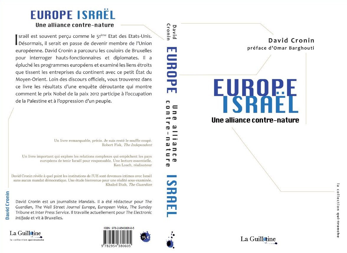 Les critiques sont, à juste titre, élogieuses. Un livre important pour Ken Loach. Robert Fisk, lui , a eu le souffle coupé. Avec Europe, Israël : une alliance contre-nature, David Cronin signe en effet un ouvrage capital, une enquête approfondie qui met en lumière les liens étroits que les milieux politiques et économiques du Vieux Continent ont tissés avec l’État colonial du Proche-Orient. Journaliste irlandais ayant notamment évolué au Guardian avant de rejoindre l’Electronic Intifada, David Cronin vit à Bruxelles et est un fin connaisseur des arcanes de l’Union européenne. Nous vous proposons régulièrement des traductions de ses articles. Aujourd’hui, nous vous dévoilons une partie de son dernier livre paru en français aux éditions La Guillotine.