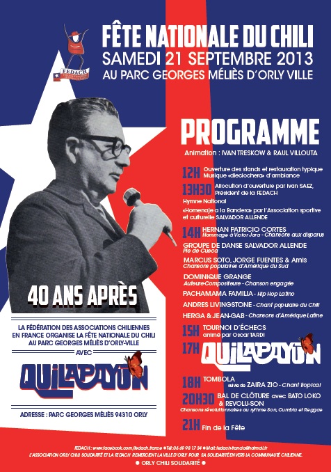 C’est samedi prochain à Orly (Parc Melies), l’Association des Familles Adoptives d’enfants nés au Chili (présidé par Ivann, adopté du Chili) vous y invite pour partager un moment de fete organisé par la FEDACH (Federation des Associations chiliennes de France), goûter aux spécialités chiliennes. Une vingtaine de stands, concerts gratuits et les Quilapayun présents, plus un billet d’avion pour le chili à gagner...