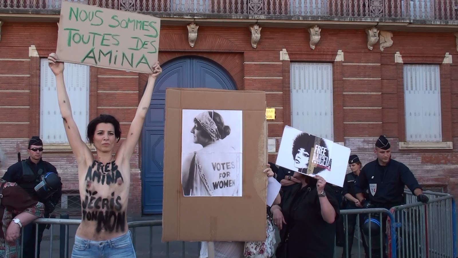 Ce jeudi 4 juillet, lors d’un rassemblement devant le consulat de Tunisie à Toulouse (organisé par le collectif de solidarité féministe avec la FEMEN Amina Sboui pour demander sa libération), une de nos militantes a été arrêtée pour s’être mise torse nu et les personnes rassemblées ont été prises à partie de manière violente par les CRS . Son acte politique et pacifique ( elle avait écrit sur son torse Free Amina, j’écris ton NON) a été réprimé de manière discriminatoire car en solidarité avec elle des hommes et des femmes présent-e-s se sont découvert-e-s le torse mais pour ces personnes aucune injonction ou violence n’a eu lieu.