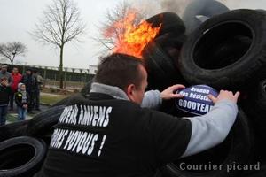 Slogans que l’on pouvait entendre devant les 1 173 pneus en feu symbolisant la menace qui pèse sur l’ emploi de 1173 salariés de l’usine Goodyer à Amiens.
