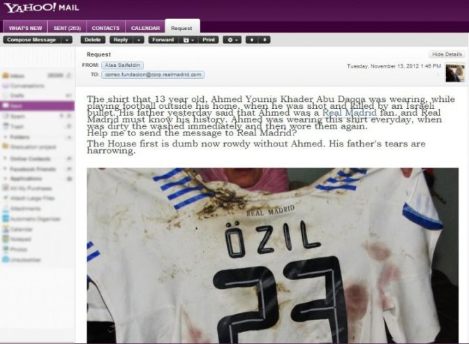 L’armée israélienne, qui a tué samedi 3 enfants d’une même famille, est allée dès le lendemain attaquer la famille et les voisins lors de l’enterrement de ces mêmes enfants. L’un des enfants de 13 ans, Ahmed, était en train de jouer au foot. C’était un fan du Real Madrid. Que les jeunes footballeurs qui comptent aller jouer la coupe européenne de foot en Israël en juin prochain, s’ils en ont le coeur, se le disent. Voici le T.Shirt qu’il portait :
