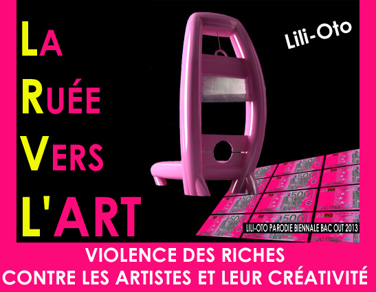 Marre de subventionner et d’assister les riches avec les millions d’euros du contribuable français dit l’artiste plasticien Lili Oto pendant que les artistes plasticiens en France comme en Grèce, en Espagne, au Portugal plongent dans la pauvreté. Les électeurs de gauche sont pris en otage par cette oligarchie politique et cette caste de technocrates culturels à leur service. Nos bulletins de vote sont encore une nouvelle fois bafoués, ridiculisés, nargués, méprisés, brocardés sur l’hôtel de la financiarisation véreuse.