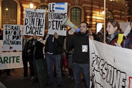 "Une centaine de militants pro-palestiniens ont manifesté mercredi soir à Toulouse pour critiquer ce qu’ils considèrent comme la "politique de colonisation" du Premier ministre israélien Benjamin Netanyahu et dénoncer sa visite en France. /Photo prise le 31 octobre 2012/REUTERS/Jean-Philippe Arles