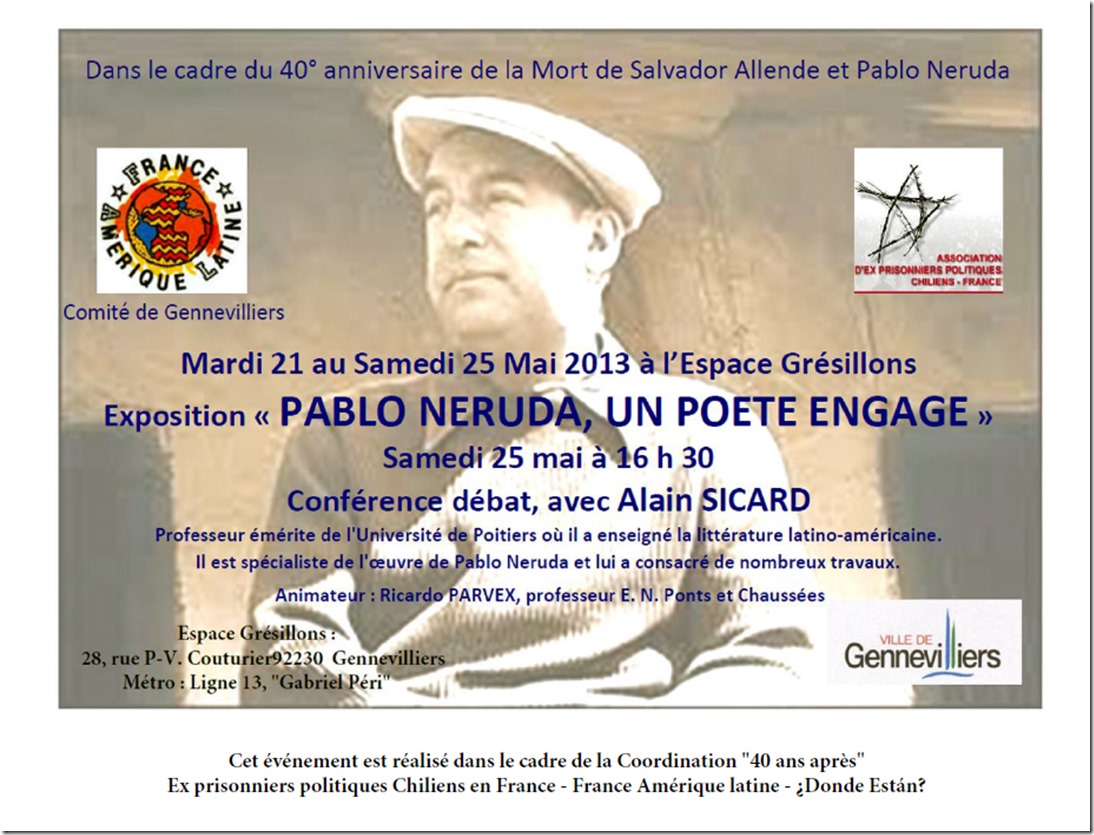 Publie le vendredi 3 mai 2013 par Clair de lune - Open-PublishingDans le cadre du 40eme anniversaire de la mort de Salvador Allende et de Pablo Neruda, France Amérique latine vous invite à participer à :