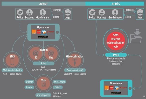 La PNIJ doit être mise en service en septembre prochain et rendre obsolètes les trois plates-formes actuellement spécialisées dans l’interception des données. L’une concerne les SMS (le STIJ) : elle a coûté plus de 1 million d’euros. Les deux autres ont trait à l’Internet fixe et mobile. Appelées Cariatide et Primatice, elles vont également cesser leurs activités. Quant aux six entreprises gérant les centrales d’écoutes téléphoniques, elles vont reprendre les 10 000 ordinateurs mis jusqu’ici à la disposition de la police. "Finalement, pour écarter des petites sociétés privées du marché des écoutes, ils ont fait appel à une grosse société... privée. Tout cela est ubuesque", observe avec amusement un ancien gendarme.