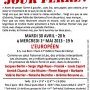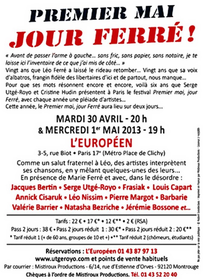 Publie le mercredi 17 avril 2013 par Norbert GABRIEL - Open-PublishingCette annnée, le jour Ferré sera double, 30 avril et 1 er mai, avec une belle bande de copains d’abord du vieux Léo qui sera fêté à l’Européen, à partir de 20 h le mardi, et à partir de 19 h le mercredi. Une belle affiche -rouge- d’artistes qui seront présents les deux jours pour quelques uns, avec des invités, des surprises, donc deux soirées qui se complètent, une bonne raison de prévoir la réservation d’un pass pour les deux jours, à des conditions préférentielles, voir ci-après :