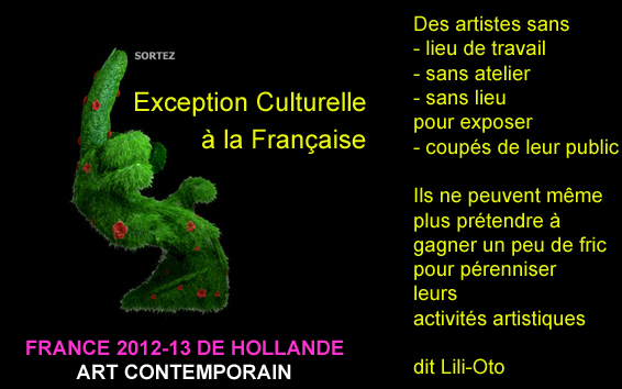 dit L’artiste Lili-oto quasi interdit d’exposition dans l’espace public comme beaucoup d’artistes refusant d’être les marionnettes des élus et des partis politiques de tous les bords politiques qui ont une mainmise totale pour leur marketing politique sur nos espaces publics d’exposition financés par l’argent public et qui nous refusent le droit non de s’exprimer mais d’imprimer.
