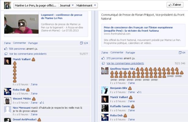 La « Poopvolution » c’est le nom donné à cette vague massive de spams, prenant la forme d’un émoticône étron. Apparue le mercredi 15 mai sur les pages de Christine Boutin et Frigide Barjot, c’est à présent Marine le Pen et le Front national qui sont la cible des internautes. À un tel point, que la page officielle de la dirigeante a été momentanément clôturée jusqu’à nouvel ordre, le temps que passe la colère. Nombreux, semble t-il, « polluent » ainsi par ces commentaires, parfois accompagnés de textes, les articles et pages de discussion. Des pages communautaires ont depuis émergées, et la fronde ne semble pas connaitre de limites. La tendance se confirme toujours sur de très nombreuses pages de droite et d’extrême-droite, à des degrés variables, les dernières « victimes » étant par exemple la page de l’U.M.P. Franck Margain (candidat aux primaires parisiennes), celle d’Henri Guaino, de l’Aube dorée Lorraine, ou encore du Front comtois. Une protestation un peu « pipi-caca » mais qui illustre la force d’un activisme 2.0 de masse, relayant une véritable furie populaire contre les rétrogrades de tous poils.