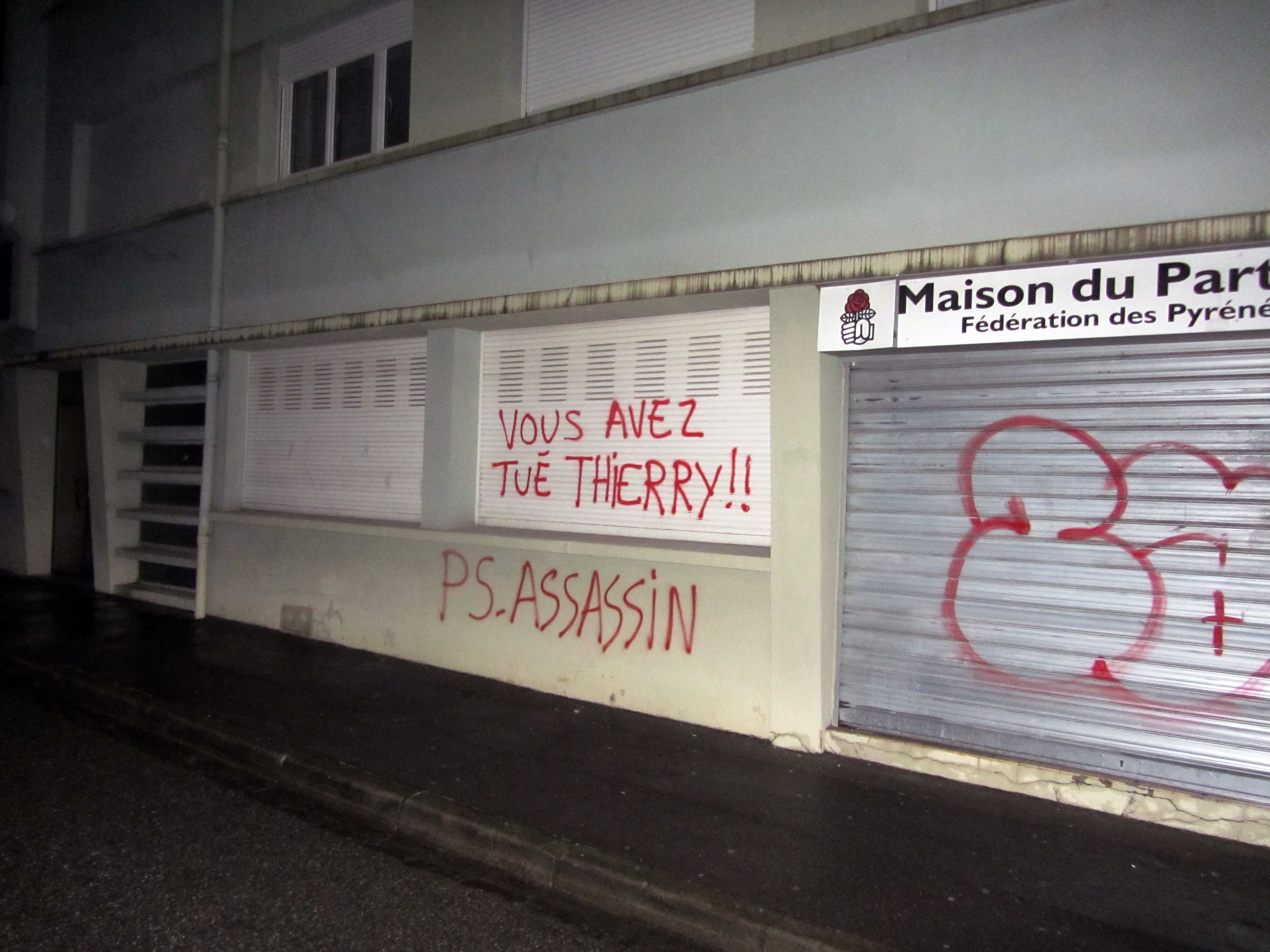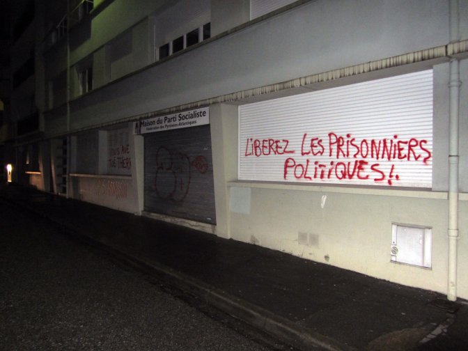Dans la nuit de samedi a dimanche le bureau de la Fédération départementale du PS des Pyrénées Atlantique, à Pau, a été recouvert de slogans dénonçant le traitement inhumain qui a conduit à l’aggravation de l’état de santé, puis à la mort de Xabier "Thierry" López Peña.