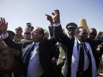 François Hollande symbolise la fin de la Françafrique dans le discours tout en la consolidant très énergiquement. Ici à Tombouctou avec Dioncounda Traoré