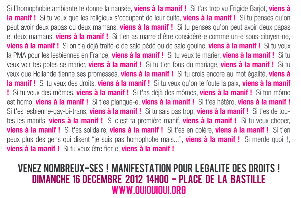 Dimanche 16 décembre se tient à Paris la manifestation des partisans du projet de loi relatif au mariage et de l’adoption pour tou.te.s. Le collectif Egalité Oui Oui Oui sera massivement présent dans le cortège et appelle tous les citoyens à rejoindre les rangs de la marche pour réclamer haut et fort la complète égalité des droits. Oui au mariage, oui à la filiation, oui à la PMA !