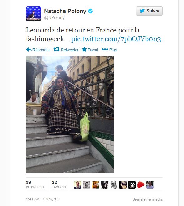 On y voit une femme d’origine rom qui fait la mendicité sur les marches d’un escalier du métro portant un vêtement de la marque Givenchy. La journaliste y va de son commentaire, qu’elle croit drôle : "Leonarda de retour en France pour la fashionweek…"