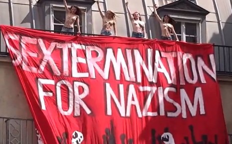 Les Femen sont alors apparues au quatrième étage d’un immeuble faisant face à la place des Pyramides. Les quatre activistes, seins nus, ont étiré une banderole sur laquelle on pouvait lire "sextermination for nazism" (sextermination pour le nazisme en français, ndlr) et "neofeminism is watching you" (le néoféminisme vous regarde, ndlr). En bas, les militants d’extrême droite leur ont répondu par des huées et des insultes. "Femen au bûcher" ou "Femen salopes", ont crié certains.