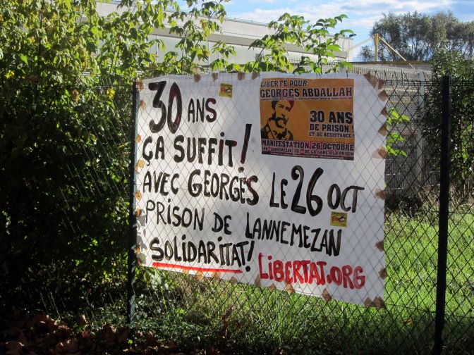 Au Liban, dans le Monde arabe, mais aussi en Europe et dans le reste du monde, la lutte pour sa libération s’amplifie. Car seule une forte mobilisation populaire fera sortir Georges Abdallah de prison. Nous appelons à un rassemblement le plus large possible, le samedi 26 octobre 2013 à 14h à Lannemezan devant la prison où il est enfermé. Pour reprendre ses mots « Ensemble, camarades, nous vaincrons et ce n’est qu’ensemble que nous vaincrons ».