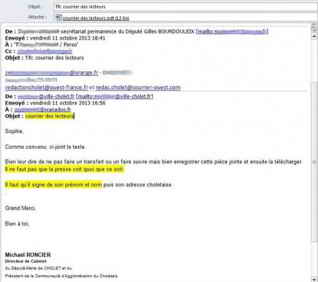 La mairie voulait envoyer un courrier de lecteurs bidon. Un e-mail signé du directeur de cabinet du maire de Cholet, Gilles Bourdouleix demande qu’un habitant adresse un courrier à Ouest-France et au Courrier de l’Ouest. Objectif : attirer l’attention sur un communiqué justifiant le renvoi de la directrice d’un Etablissement d’Hébergement pour Personnes Agées Dépendantes (EHPAD).