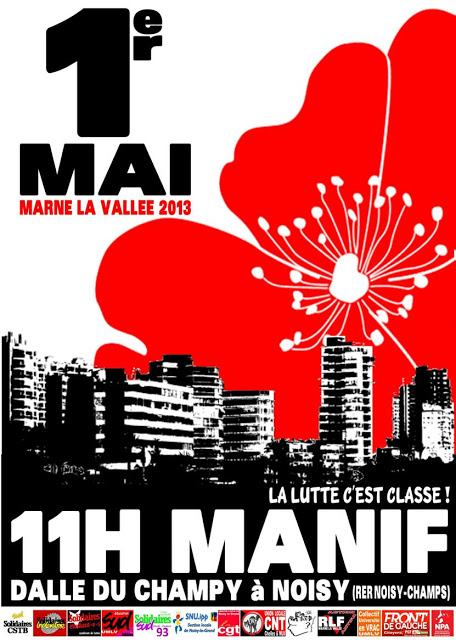 Ce 1er mai 2013, nous invitons les travailleur-se-s, les chômeurs-se-s, les précaires, les retraité-e-s, les jeunes, les habitant-e-s des quartiers populaires avec ou sans papiers de Marne la Vallée et alentours à descendre dans la rue pour participer à cette marche fraternelle et offensive et à se rendre à la manifestation l’après-midi à Paris !