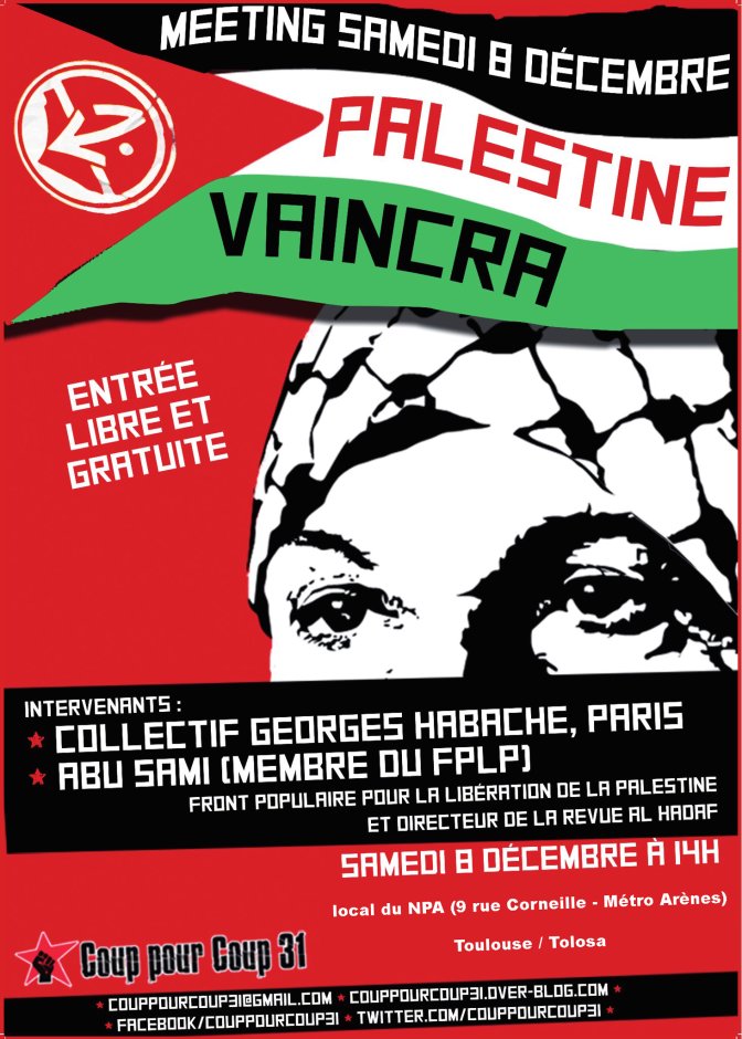 Nous appelons maintenant tous les soutiens de la cause palestinienne a permettre la tenue de cette réunion avec Abu Sami, représentant du Front Populaire pour la Libération de la Palestine, samedi 8 décembre à 14h, au local du NPA (9 rue Corneille – Métro Arènes).