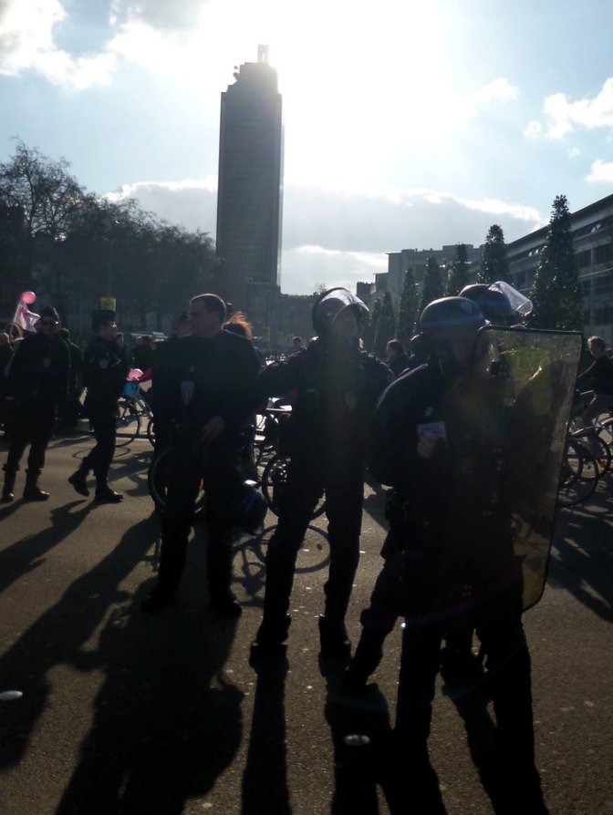 De mon côté, j’ai le sentiment d’être invisible, je suis derrière les CRS, submergé par la marée fière de vélos qui défilent, arrachant un drapeau par-ci, décochant un coup de pied par là, hors de moi.
