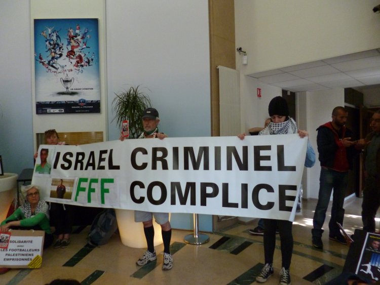 Publie le mercredi 17 avril 2013 par Open-PublishingUne quarantaine de femmes et d’hommes ont occupé la Fédération Française de Football (FFF) à Paris, ce mercredi 17 avril 2013, journée internationale de soutien aux prisonniers palestiniens, pour demander des nouvelles d’Omar Abu Rouis et MohAmed Nemer, footballeurs de l’équipe nationale palestinienne emprisonnés depuis plus d’un an, en détention "administrative" par Israël.