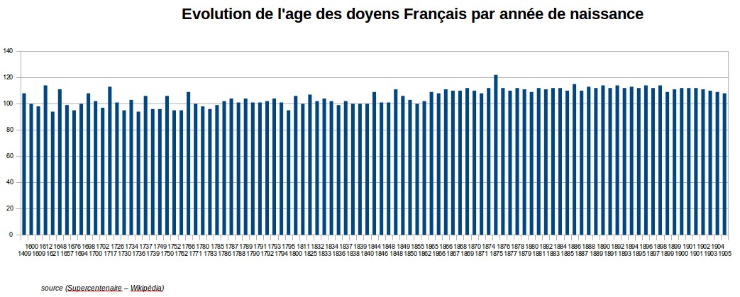 L’idée que les centenaires seraient un phénomène récent lié à l’évolution des conditions de vie est faux. Visiblement, chaque être humain peut espérer pouvoir vivre jusqu’aux alentours des 120 ans ; 122 ans est le record de longévité obtenu par Jeanne Calment qui est la doyenne de l’humanité, c’est à ce jour, l’être humain ayant vécu le plus longtemps et ce de manière prouvée. Il est probable que la paix relative que connaît la France depuis plus d’un demi siècle peut expliquer la régularité de l’age limite, atteint par nos doyens, qui apparaît à droite du graphique.