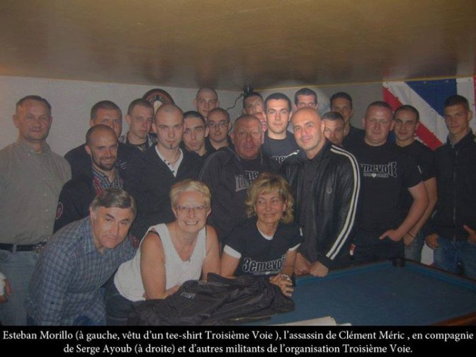 Voici la preuve incontestable et définitive qu’Esteban Morillo, le tueur de notre camarade Clément, est un militant de Troisième Voie, groupe d’extrême droite dirigé par Serge Ayoub. On observe sur cette photo Esteban Morillo (vêtu d’un tee shirt Troisième Voie) en compagnie d’un certain nombre d’autres militants dont leur leader Serge Ayoub.