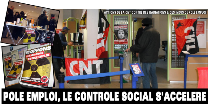 Pour résister, nous devons nous regrouper. Nous menons une action contre le contrôle social des chômeurs en proposant un cadre d’informations juridiques et d’actions collectives pour « stopper les radiations » du Pôle Emploi. Qu’est ce qu’on y gagne ? Beaucoup de bons moments et du contrôle social en moins, parce que l’identifiant 147852 P qui ramène vingt accompagnateurs quand son conseiller à l’emploi ou son travailleur social le fait chier a de grandes chances qu’on lui foute la paix quelques temps, même en cette période de pressions accrues. N’hésitez pas à contacter la CNT ou à passer directement à l’une de nos permanences syndicales.