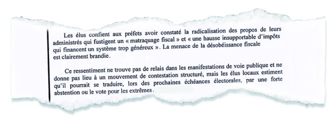 Dans ce contexte, "les élus confient avoir constaté la radicalisation des propos de leurs administrés qui fustigent ’un matraquage fiscal’ et ’une hausse insupportable d’impôts qui financent un système trop généreux’." Et les préfets de conclure : "La menace de désobéissance fiscale est clairement brandie."