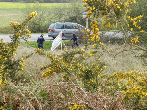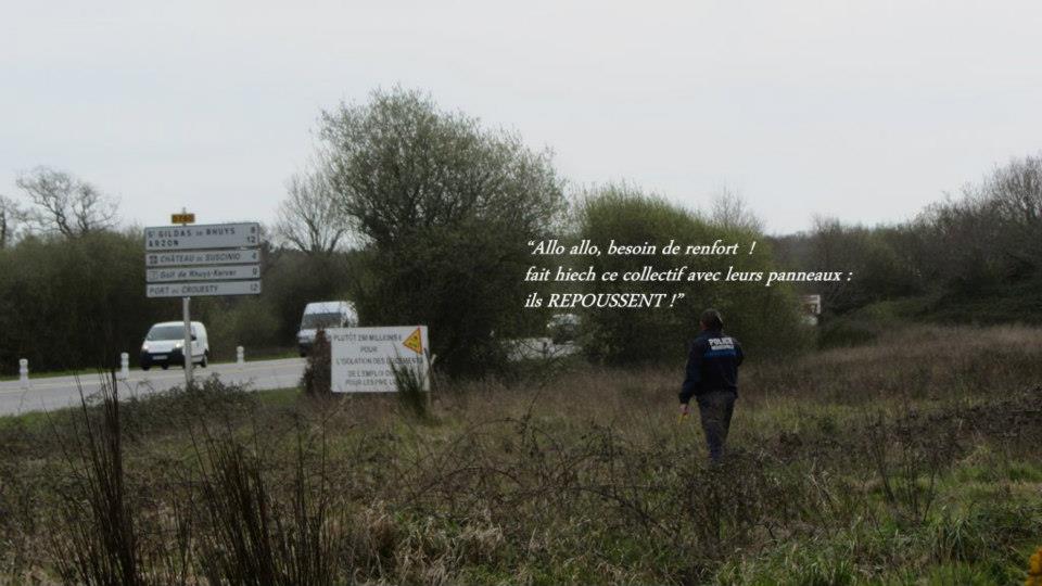 En allant au troisième endroit, on a retrouvé à terre un panneau. Nous avons alors décidé d’aller le planter là où les 2 consécutifs ( chaine humaine + panneau texte) ont été enlevés radicalement. Alors que nous finissions de planter le panneau solidement, on a aperçu au loin un policier municipal qui relevait nos plaques d’immatriculation. Pas besoin de faire le guet et chercher qui étaient les cow-boys qui avaient soustrait de la vue les informations concernant la chaine humaine et l’aberration de ce projet ;- ) , on tenait la réponse ! En effet, il nous a alors renseigné(e)s : les 2 panneaux ont été enlevés sur ordre de la Préfecture !!! Ce qui nous semble totalement dénué de sens. Il paraitrait que cela relève de trouble à l’ordre public ?! Le policier municipal (sympa au demeurant), nous a dit que la Préfecture avait le droit d’intervenir même sur les terrains privés. Là, en l’occurrence, les panneaux seraient incitatifs à la rebellion ! Un deuxième est alors arrivé après que le premier l’ait appelé en renfort (puisqu’il n’était pas question qu’on l’enlève nous-même malgré la demande ! ) Ce dernier, nous a demandé "pourquoi vous faites de la propagande pour une chaine humaine qui se passe à Notre dame des Landes" ? on lui a alors rétorqué que dans toutes la France fleurissent de tels panneaux (reste à espérer qu’ils n’aient pas le même sort que sur la Presqu’île).