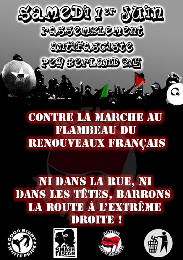 Une fois de plus nous voyons une tolérance de la préfecture envers ces propos en leur accordant de permis de manifester, c’est à nous de nous opposer à ce genre de regroupement, ici à bordeaux, mais cette lutte est mondiale, en soutien aux peuples grecs, des pays de l’est (hongrois, polonais, russes), des italiens, espagnoles et beaucoup d’autres... qui subissent le harcèlement fasciste, raciste, homophobe et sexiste.