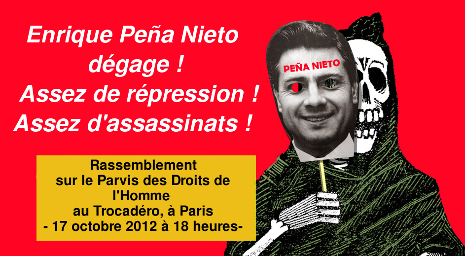 Nous craignons que la répression soit encore plus forte sous le mandat de Monsieur Peña Nieto arrivé au pouvoir avec ses mains tachées de sang, pour cette raison nous lançons un appel aux organisations, collectifs, individus à se manifester ce mercredi 17 octobre sur le parvis des Droits de l’Homme, au Trocadéro, à Paris à partir de 18 heures.