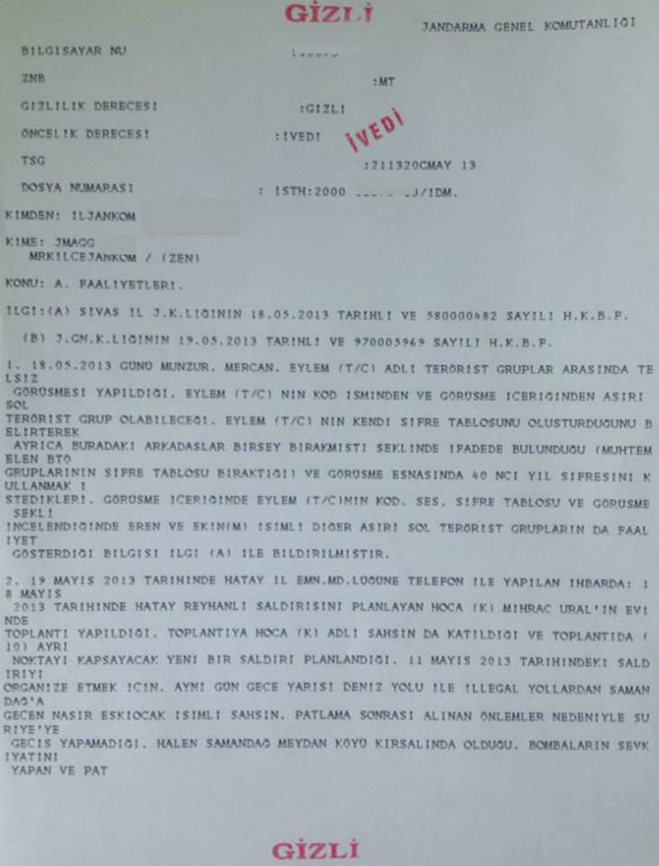 Redhack, un groupe de hackers Turcs, a publié une série de câbles qui révèlent ce qui était connu des préparatifs du double attentat de Reyhanlı d’après les fichiers top secrets des services de renseignements de la gendarmerie turque.
