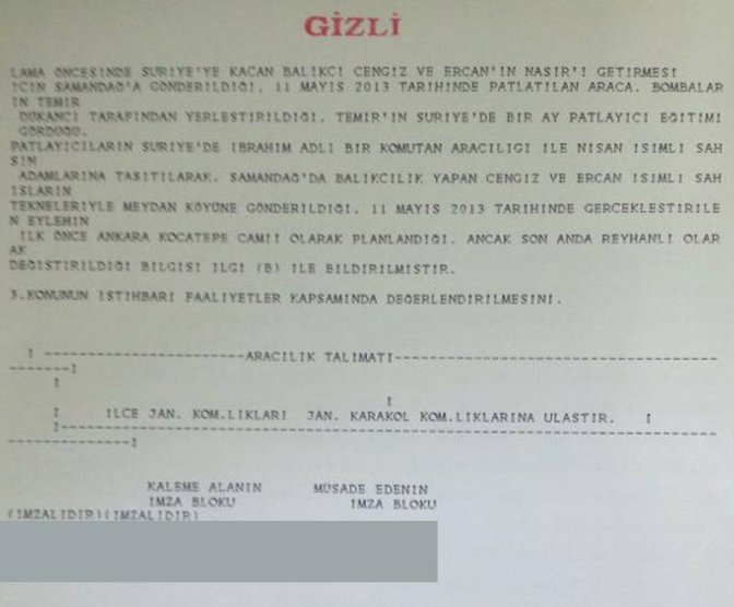 Les fichiers top secrets rendus publics par le groupe sont dates du 20 mai – 9 jours après l’attentat meurtrier qui a tué 51 civils dans la ville méridionale de Reyhanli, province de Hatay.