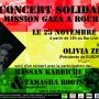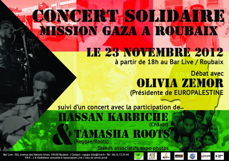 Publie le jeudi 22 novembre 2012 par Open-PublishingUne soirée exceptionnelle ce vendredi 23 novembre à Roubaix à partir de 18 H, avec la venue exceptionnelle et bénévole de HASSAN KARBICHE (Ch—âabi) et TAMASHA ROOTS (Reggae/Roots), mais aussi un débat sur ce que nous pouvons faire face à la persécution du peuple palestinien par les criminels de guerre israéliens.