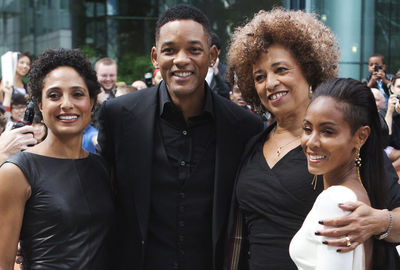 La réalisatrice de Free Angela and All Political Prisoners Shola Lynch, les producteurs du documentaire Will Smith et Jada Pinkett Smith avec Angela Davis.