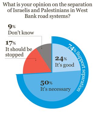 Encore plus nette est d’ailleurs la majorité favorable à un système de routes séparées pour Israéliens et Palestiniens en Cisjordanie : 50% le juge "nécessaire" et 24% "bon", ce qui porte à 74% le total de personnes interrogées qui y sont favorables. Une majorité relative (47% contre 40 qui sont d’un avis opposé) accueille favorablement l’idée de "transfert" d’Arabes israéliens dans les territoires administrés par l’Autorité palestinienne (il n’est pas précisé s’il s’agit d’un transfert physique ou d’un rattachement de localités arabes israéliennes à la Cisjordanie) et une majorité absolue (69% s’oppose à un droit de vote pour les Palestiniens dans ce qui serait un Etat unique (Israël et Cisjordanie).